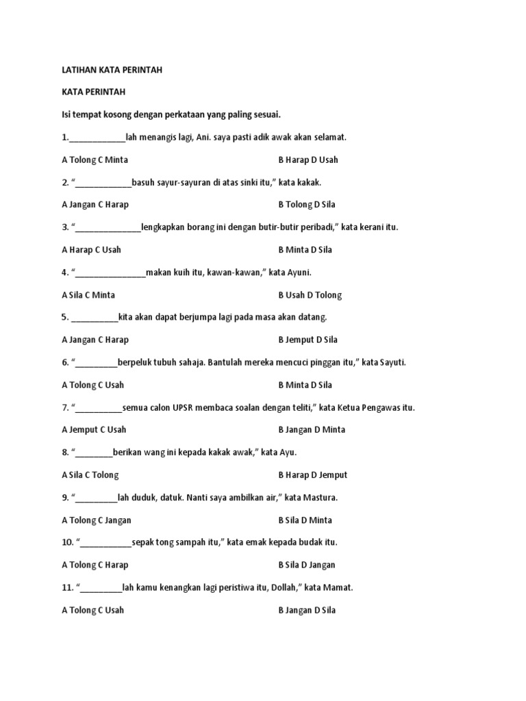 Contoh Soalan Ayat Perintah By Bio_Jayleen81 05 Jun, 2022 Post a Comment Bahasa Melayu Tahun 2 Kata Perintah Ayat Perintah Worksheet Kata Perintah Exercise For Tahun 2 Latihan Ayat Perintah Pdf Latihan Kata Perintah Pdf Ayat Perintah Pdf Share No comments for "Contoh Soalan Ayat Perintah"